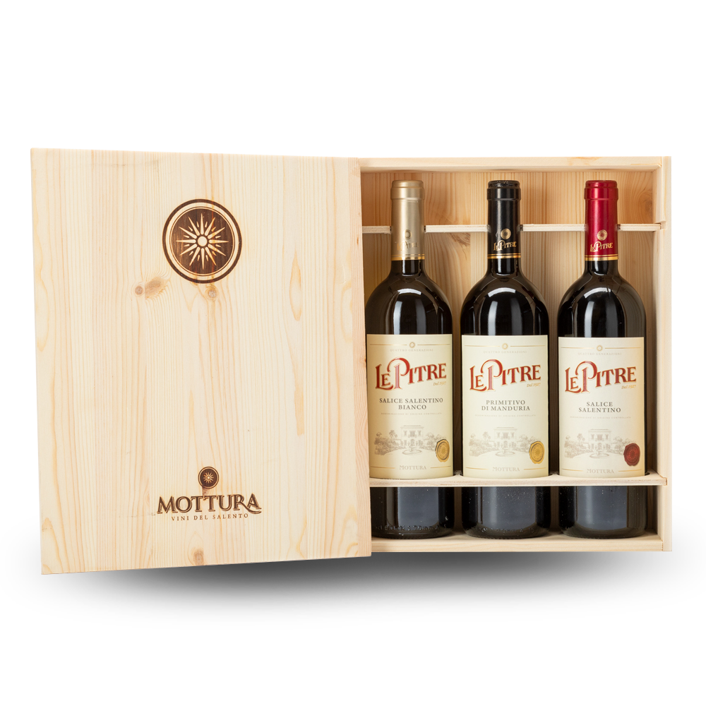 La cassetta di legno contiene tre bottiglie di vino, l'assortimento include una bottiglia per ciascuno dei seguenti vini della gamma Le Pitre: